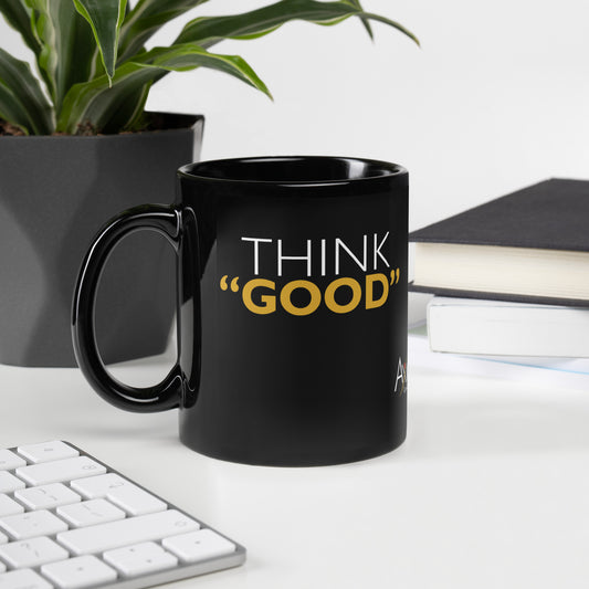 Black Glossy Mug with Logo, Think GOOD, and The Central Question