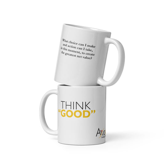 Black Glossy Mug with Logo, Think GOOD, and The Central Question